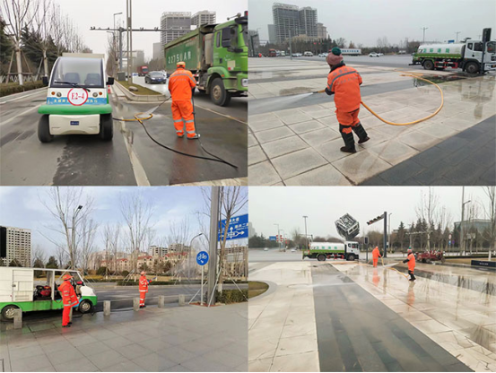 抢抓回温机会,冲洗道路见本色。气温回升期间,科学调配各种作业车辆,按照“洗扫+冲洗、人工+冲洗”模式,对主次干道、路面、护栏下进行深度冲洗、湿扫作业,恢复道路本色,有效降低道路扬尘污染,提高环境质量。