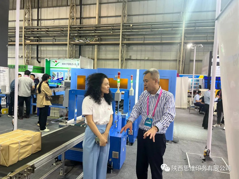 陕西思维印务有限公司总经理刘琦现场向厂家了解印刷设备。