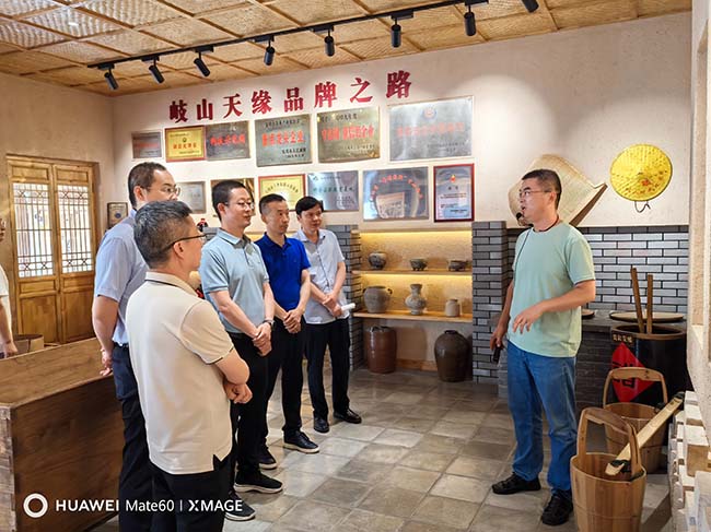 乔靖飞一行的到来受到了岐山天缘党支部书记、董事长张宗科等领导的热烈欢迎。在公司副总经理崔银科、董事长助理马伟刚的陪同下,乔靖飞一行先后实地考察了非遗传承—老作坊,中国醇醋文化展厅,大曲库房,产品展示、同心直播间、品保部、研发技术部、陕西一碗面产业研究院、醋酸发酵车间、包装车间等,天缘文旅负责人张显向客人们全面的汇报和分享了近年岐山天缘的努力和变化。大家对天缘人27年如一日在董事长张宗科带领下接续奋斗、持续创新充满敬意。