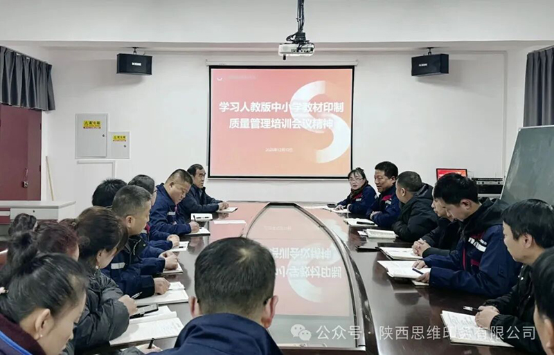 为深入贯彻落实人民教育出版社在广西北海召开的人教版中小学教材印制质量管理培训会议核心要求,切实提升人教版中小学教材印制质量,夯实中小学教材印制质量防线,2025年12月12日,陕西思维印务有限公司在总经理吴宁周的统筹部署下,由质量部牵头组织全体中高层领导、各部门负责人及质检员召开专题会议,集中传达学习人教版中小学教材印制质量管理培训会议精神,深入研读相关配套文件,精准把握文件核心内涵与实践要求。