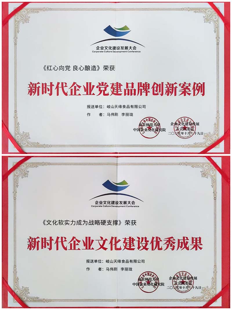 2025年8月,岐山天缘《党建引领驱动企业创新发展,三产融合助推乡村全面振兴》的案例,走上了全市非公企业党组织书记培训班的课堂;2025年10月,在第十一届全国企业文化建设发展大会上,天缘人一举摘得“新时代企业党建品牌创新案例”等两项殊荣;2025年12月初,在省委组织部组织的争创五星级非公企业党组织“评星晋级”汇报会上,评审组领导特别肯定天缘党支部对“双强六好”标准的落地实施和成果展现。