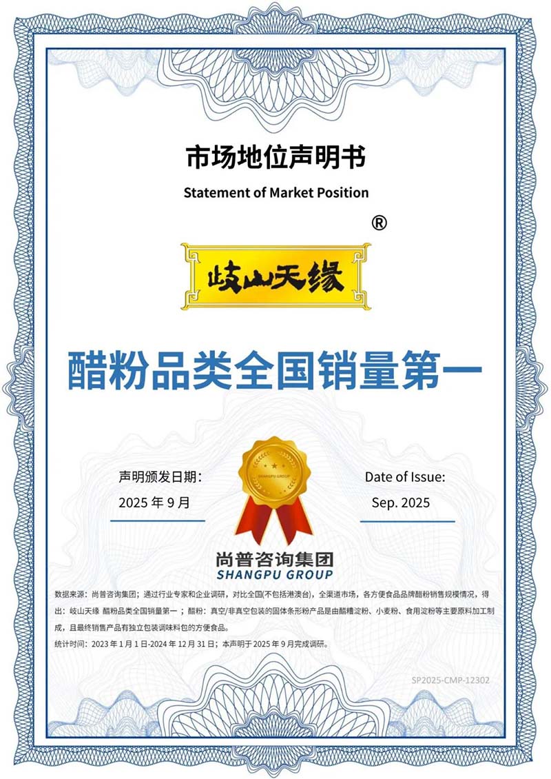 2025年,岐山天缘醋粉系列与陕西一碗面系列产品斩获“宝鸡地标美食产品”。2025年9月,岐山天缘经尚普咨询市场权威认证,成功摘得“醋粉品类全国销量第一”的桂冠。