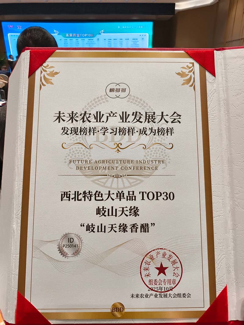 2025年10月,在作为第32届中国杨凌农高会重要组成部分的第三届未来农业产业发展大会上,岐山天缘香醋系列产品被大会授予“西北特色大单品系列TOP30”殊荣,在同时举行的第二届“三秦伴手礼”发布仪式上,“岐山天缘醇醋礼盒”系列产品被授予“优选产品”荣誉称号。