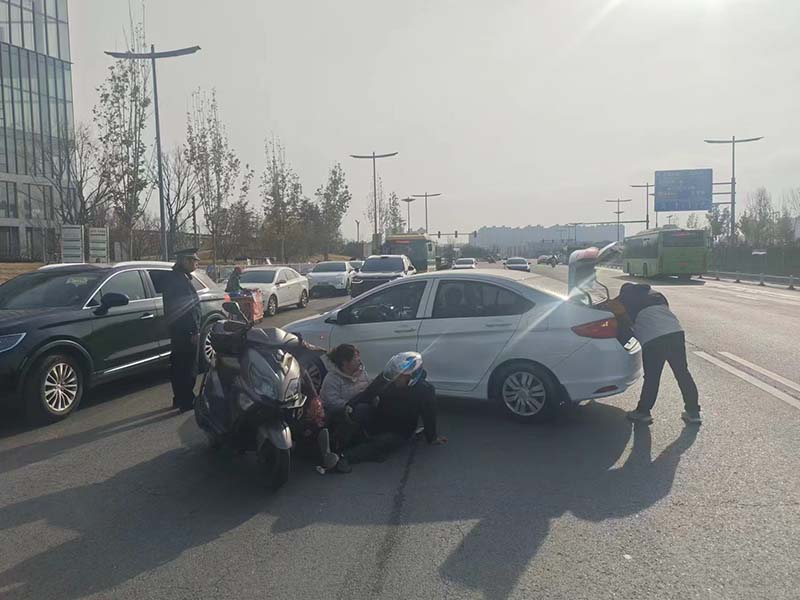 12月20日下午,浐灞国际港城管局湿地中队执法队员曹振斌、贾海波巡查至广运潭大道长安书院附近,一辆小汽车与摩托车发生剐蹭,摩托车上两名骑乘人员不慎倒地。二人立即停车上前查看,询问伤者状况,确认他们意识清醒、无明显外伤后,才放下心来。担心后面来车没注意引发危险,他们帮助小汽车驾驶员在车后摆好警示三脚架,然后一人留在旁边陪着伤者,安抚他们别着急;另一人在路边疏导过往车辆慢慢绕行,同时打了报警电话,把现场情况说清楚。一直等到交警赶到接手,两人才继续前往下一个路段巡查。