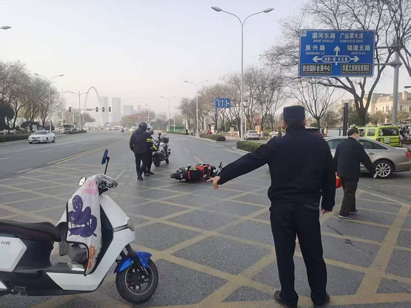 1月8日夜间巡查中,浐灞国际港城管局矿产资源中队执法人员巡查至港务大道与保税三路十字时,发现一起轿车与摩托车相撞事故,摩托车驾驶员倒地不起,表情痛苦。