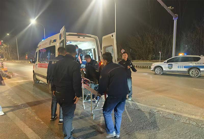 夜晚车流密集,现场十分危急。执法人员贾昊斌立即停车,快步上前俯身询问伤者意识,在确认其颈椎与脊柱无明显撞击风险后,为其披上反光保暖外套。