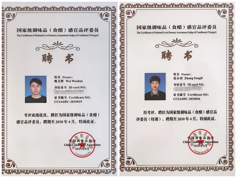 2025年6月,陕西省调味品协会专家组调研天缘创新发展并现场召开“守工艺之正,创市场之新”的主题座谈会,与会领导高度肯定天缘人在守正与创新方面务实的探索和对行业健康发展做出的卓越贡献。在2025年全国调味品(食醋)感官品评技能水平考评活动中,岐山天缘公司魏文辉、张永利两位同事在考核中脱颖而出,魏文辉被授予“国家级调味品(食醋)感官品评委员”,张永利被授予“国家级调味品(食醋)感官品评委员(特邀)”荣誉。