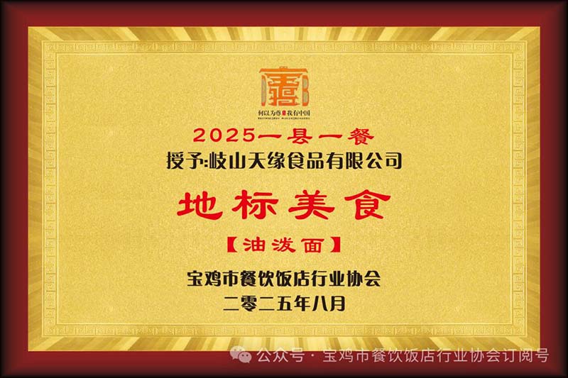 2025年,岐山天缘醋粉系列与陕西一碗面系列产品斩获“宝鸡地标美食产品”。2025年9月,岐山天缘经尚普咨询市场权威认证,成功摘得“醋粉品类全国销量第一”的桂冠。