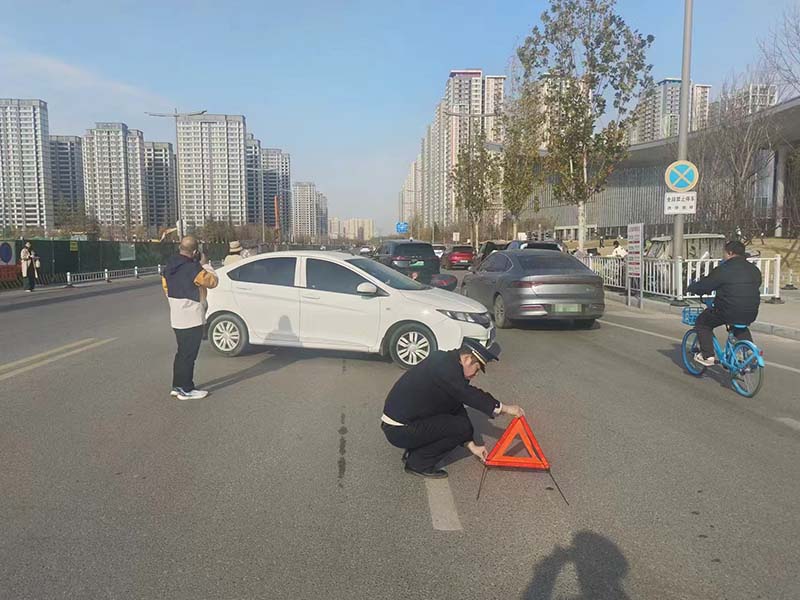 12月21日晚,气温已降至冰点,湿地中队城管队员张波和刘令巡查到广运潭大道与元朔大道十字时,发现两辆车撞在了一起。好在没有人员受伤,就是车子停在路中间,影响来往车辆通行。两人赶紧下车,帮司机把三角警示架摆到安全位置,提醒路过的车辆减速避让。随后在现场引导交通,确保道路通行顺畅,同时将司机护送至路边安全区域,告知其联系交警和保险公司的流程,耐心等候相关人员到场,直至现场秩序恢复正常、交接妥当,才放心离开。