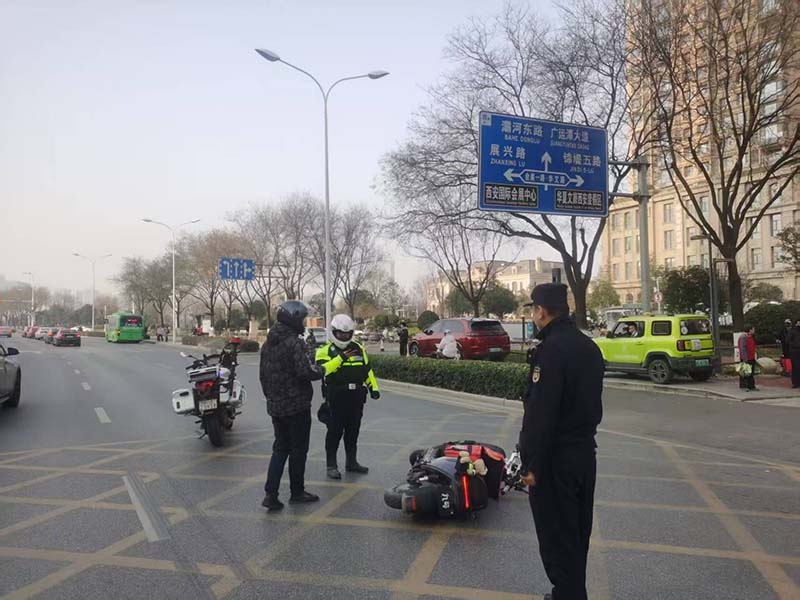 1月10日,执法队员孙昭辉、毛浩在欧亚大道与会展二路路口发现两辆摩托车相撞,其中一辆侧翻,驾驶员被压在车下,两人立即停车上前,孙昭辉小心抬起摩托车,将驾驶员搀扶至人行道安全区域,并检查其四肢活动情况。